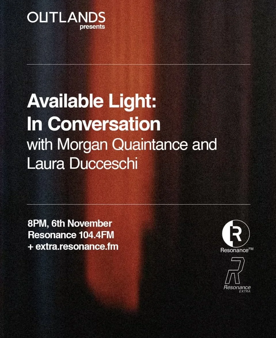 'Available Light' has appeared in different forms at Cafe OTO, the Barbican, Courtisane Festival, Ghent and other locations. For the Brighton date, ACCA will host a hybrid film screening and live performance event featuring a number of invited artists and performers. More information can be found on the ACCA and Outlands websites.